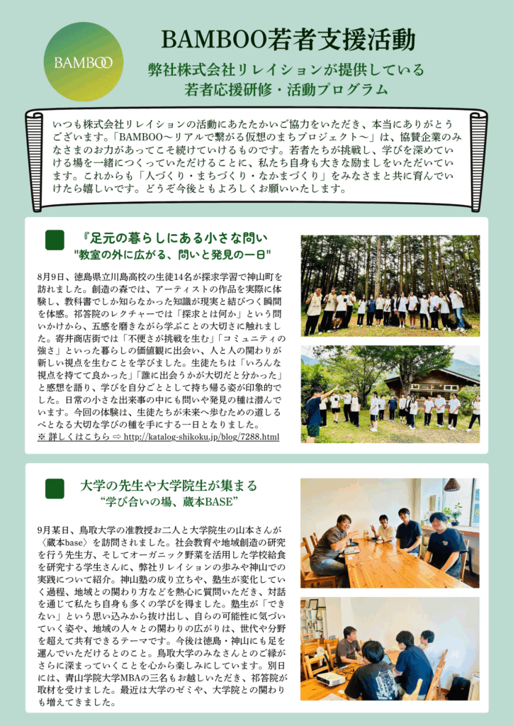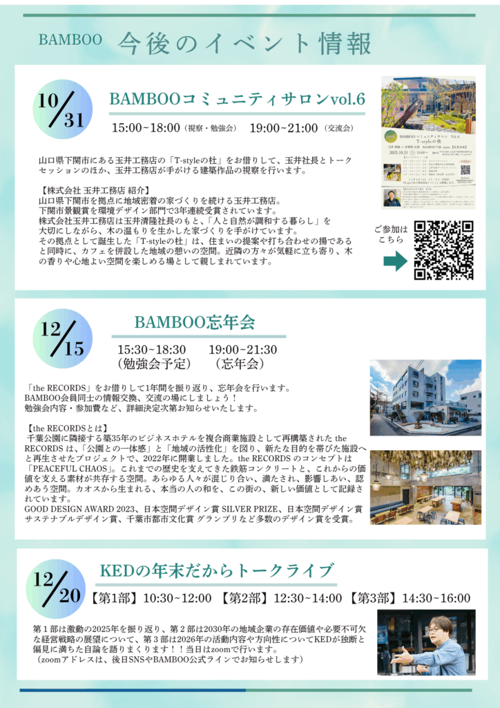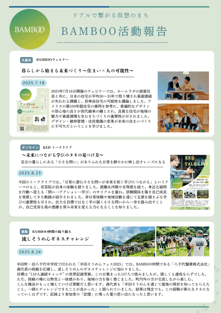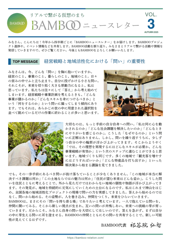 四半期ごとに「BAMBOOニュースレター」をお届けしています。BAMBOOプロジェクト進捗や、イベント情報などを共有します。BAMBOO活動を振り返り、みなさまとリアルで繋がる活動や情報を発信していきますので、ぜひご覧ください。