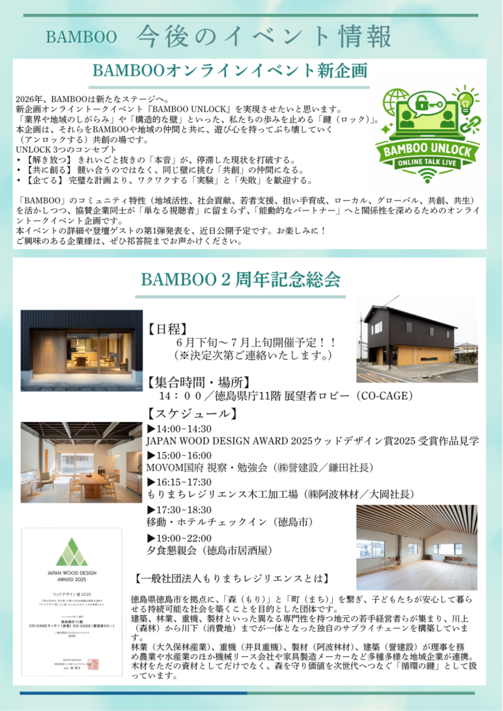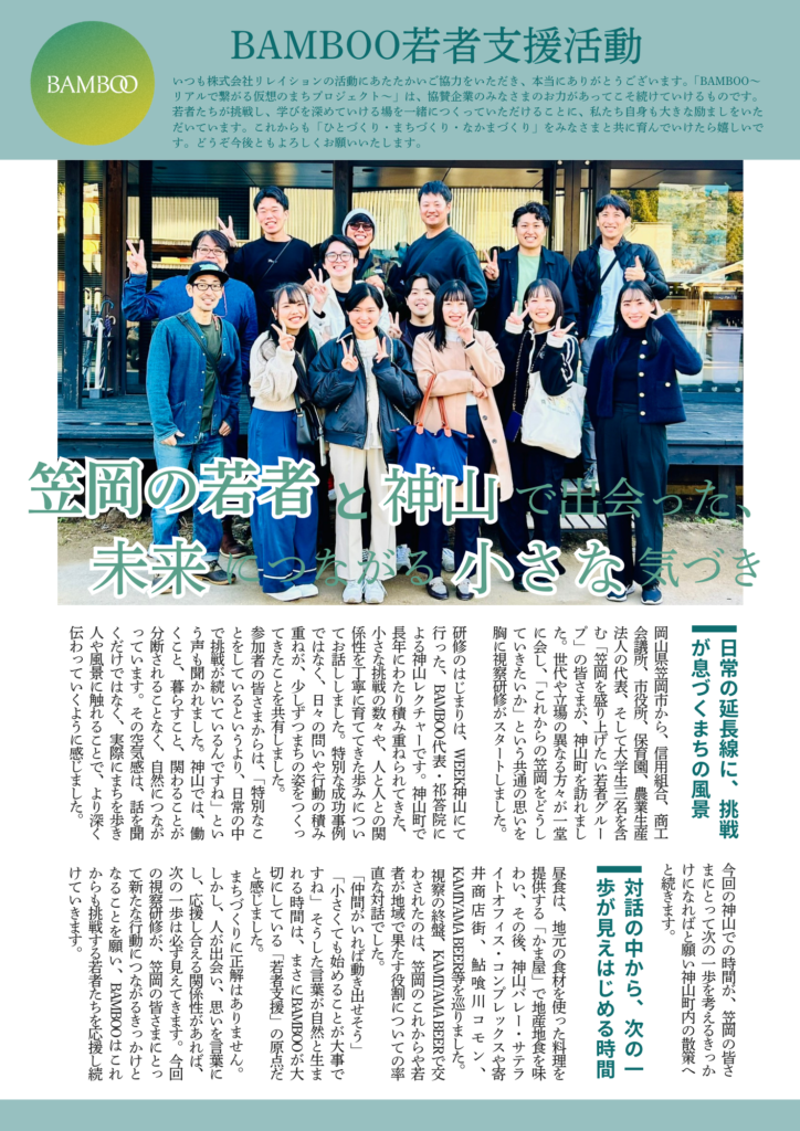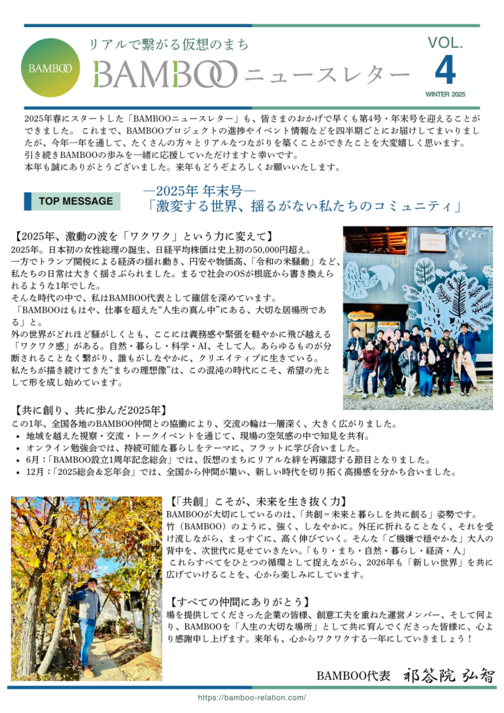 2025年春にスタートした「BAMBOOニュースレター」も、皆さまのおかげで早くも第4号・年末号を迎えることができました。 これまで、BAMBOOプロジェクトの進捗やイベント情報などを四半期ごとにお届けしてまいりましたが、今年一年を通して、たくさんの方々とリアルなつながりを築くことができたことを大変嬉しく思います。