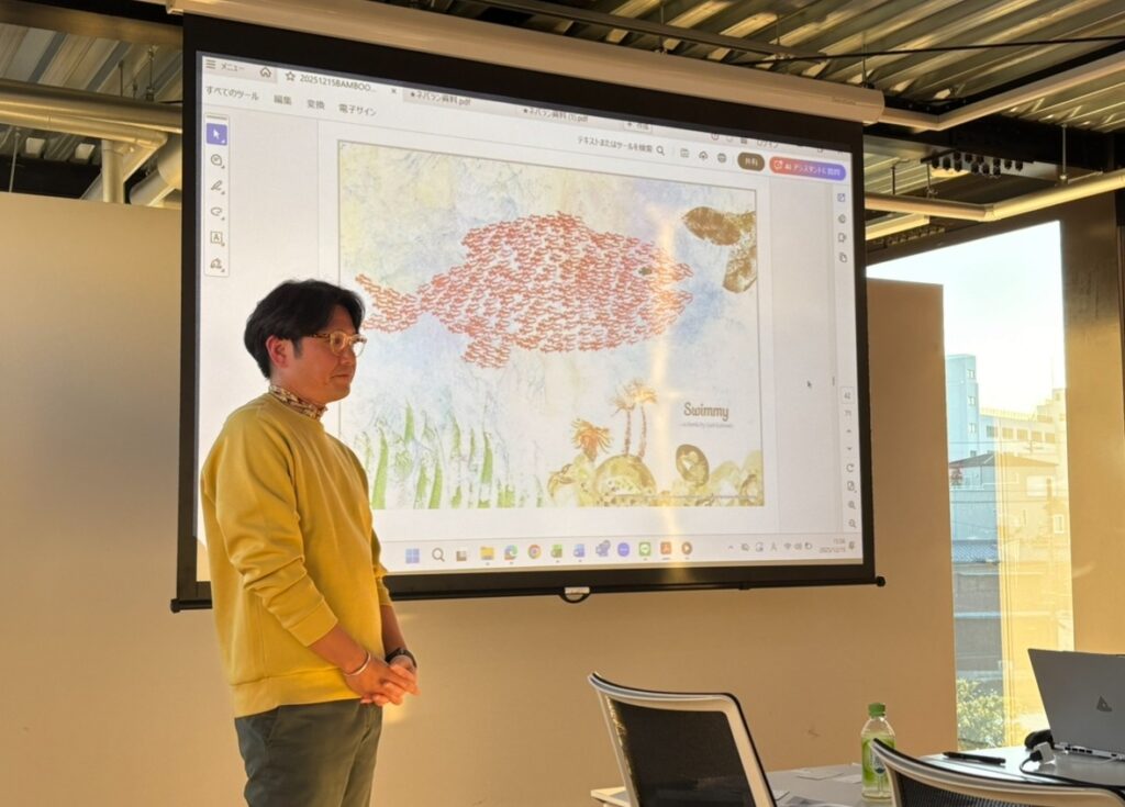 工藤社長のプレゼンは、次のようなメッセージで締めくくられました。 「自分一人の力なんて、たかが知れている。だから、自分よりすごい奴とチームを組もう。みんなで同じ方向を向いて泳げば、スイミーたちのような小さな魚の群れだってクジラに勝てる。何があってもめげずに、とことん行こうぜ!」