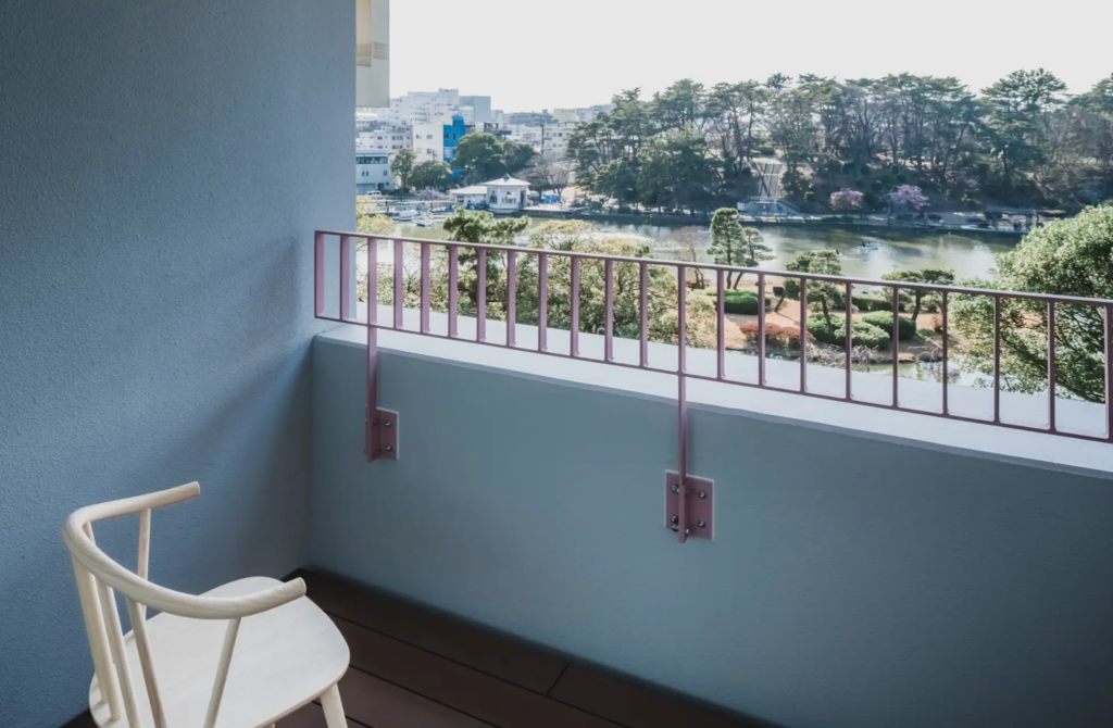 最初に拝見した「スタンダードルーム」は、コンパクトな空間でありながら、天井が高く解放感がありました。最大の魅力は、全室に備えられたプライベートバルコニーです。バルコニーに出ると、千葉公園の緑が目の前に迫り、まるで森の中に滞在しているかのようでした。